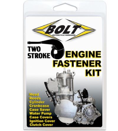 Two-Stroke Engine Fastener kits have all the external fasteners from top to bottom-end including hardware for: Heads, Reeds, Cylinder, Crankcase, Case Saver, Water Pump, Left Case Cover, Ignition Cover, Inner & Outer Clutch Covers, Power Valve Covers.