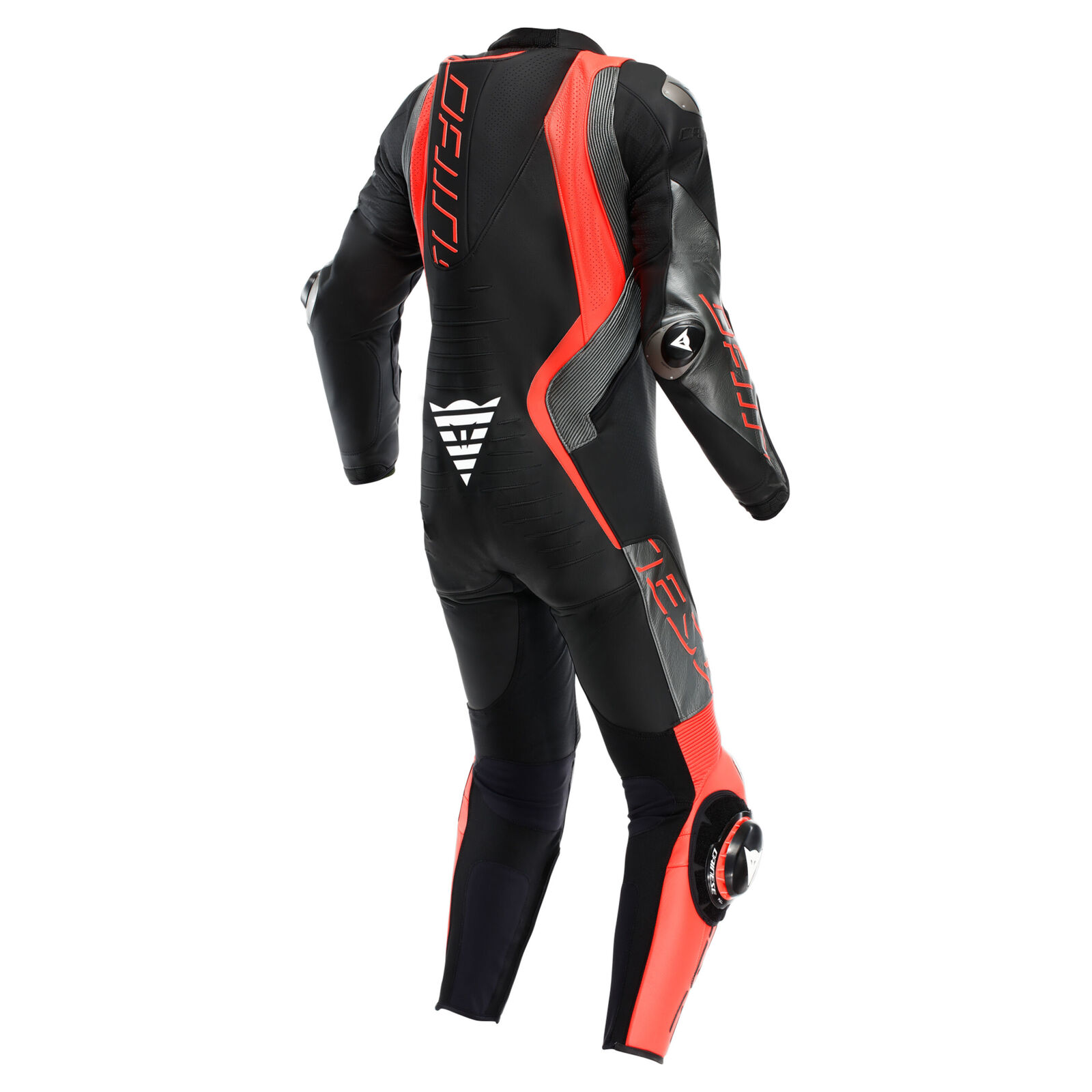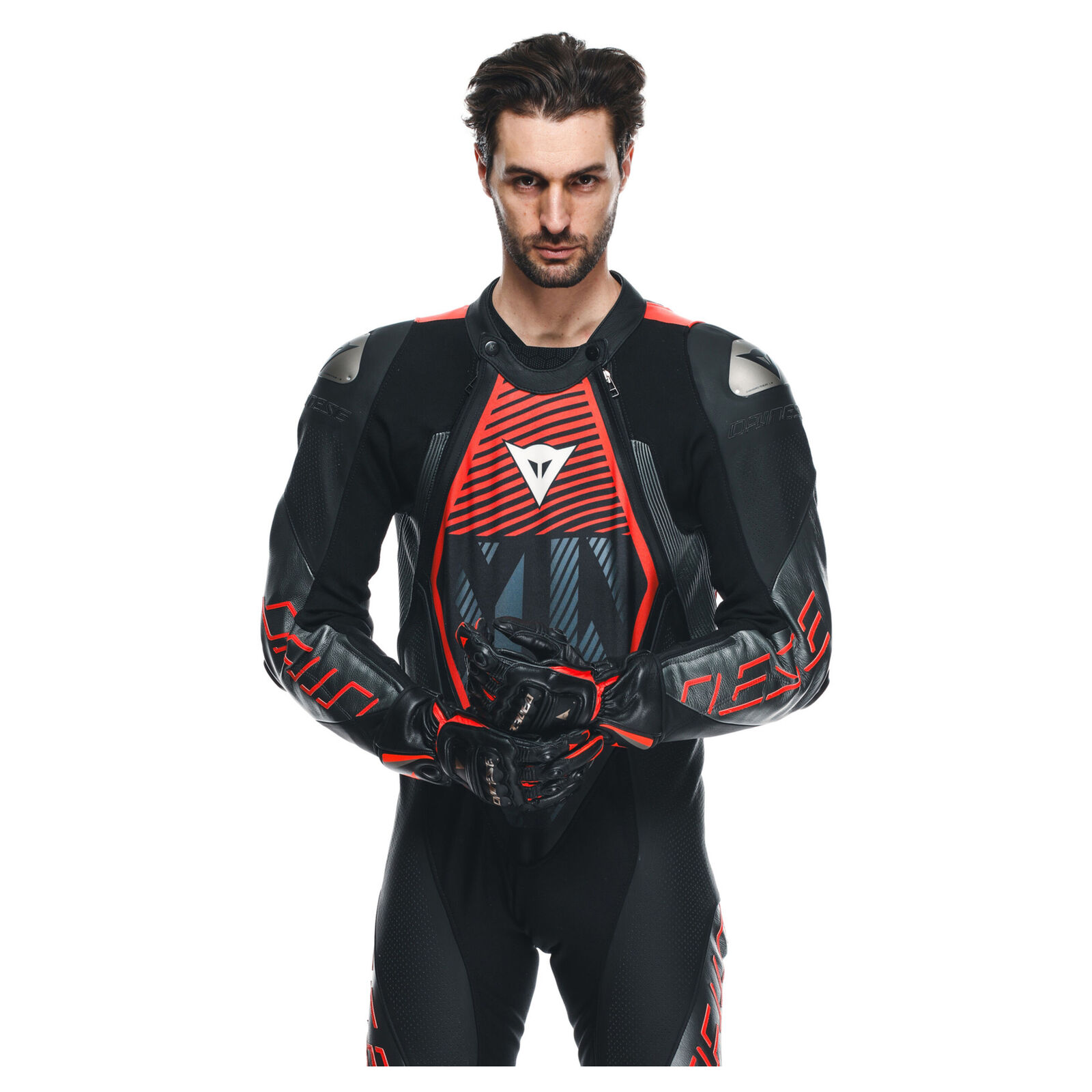 The evolution of the legendary Dainese leather racing suit, featuring a revolutionary double-zipper fastening. Also boasting the highest levels of ergonomics, freedom of movement and protection on the saddle, owing to its stretch microfiber with Microelastic inserts on back and abdomen and the integration of the latest technical solutions tested by professional MotoGP™ riders. EN 17092 class AAA certification.