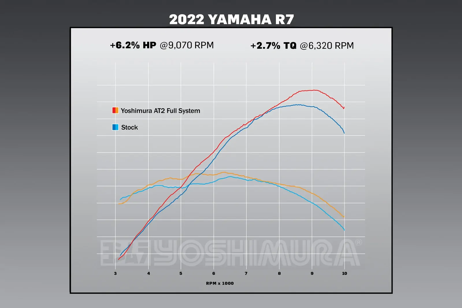 When it came to crafting a special race exhaust for the Yamaha R7, we pulled out all the stops. Modeled after the titanium version, this Works Finish stainless system is the perfect balance between performance and value. Created with premium alloy material, then prototype after prototype until we reached the final test system. On a stock engine with no mods and 91 octane pump fuel, this new system creates +5.7% max HP and +2.7% max torque. This system is designed to create even more performance with motor work and our airbox so the gains we publish are just the start of a powerful package.