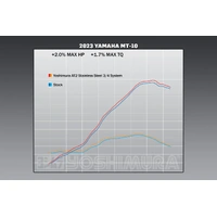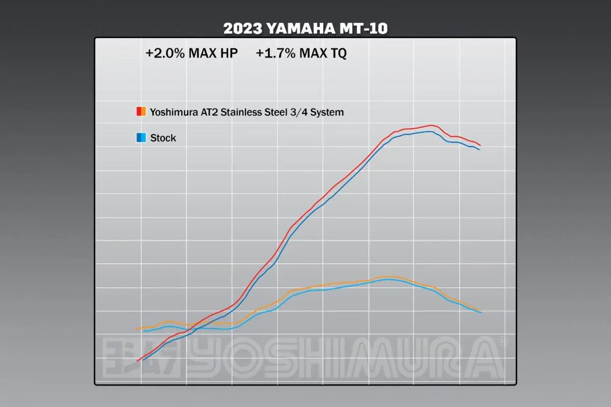 Our AT2 Race Series 3/4 system makes incredible power throughout the power spectrum, adding even more excitement on the race track with this 998cc crossplane CP4 engine. Our AT2 adds even more torque and HP to the already powerful YZF-R1 platform Max HP is up 2% over stock while max torque is up 1.7%. Weight is significantly reduced as well, our 3/4 system helps the MT-10 lose over 9 lbs. from stock! And the exhaust note you get when using the AT2 Yoshimura muffler is second to none.
